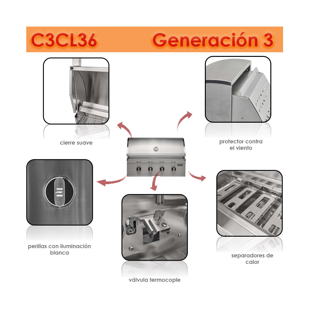 • Preparado para agregar quemador cerámico para sellar dentro del asador (se vende por separado).